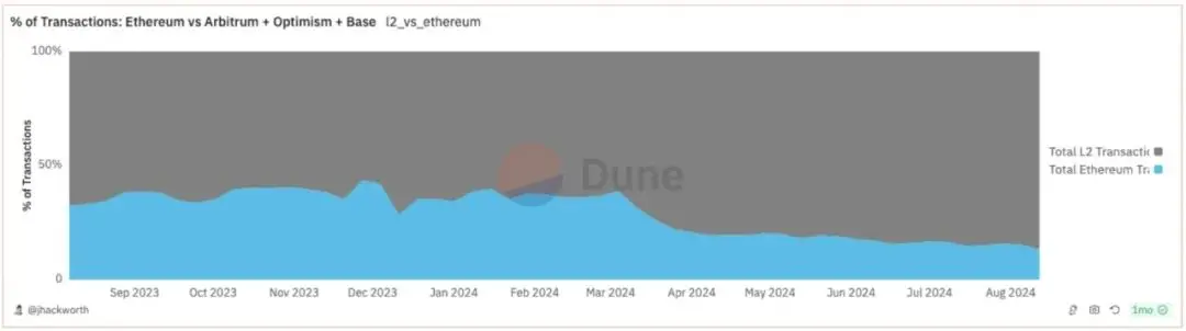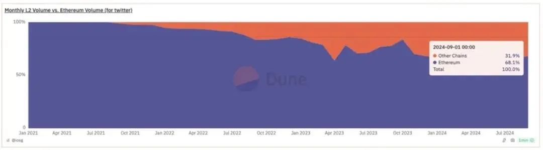 目前以太坊 L1 仍承载着整个生态超过一半的交易量。而长期来看,以太坊更类似提供了一种高度去中心化自治、抗审查、安全性最高的无许可发行 L2 的平台(结算层)。