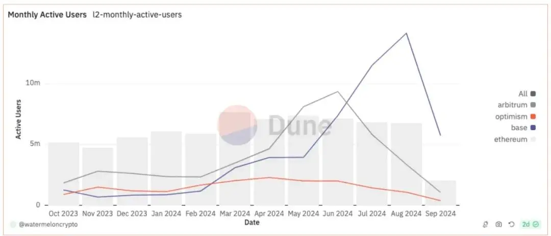 由于 L2 交易成本便宜,实际的对于以太坊整体交易数据的提高会虚高一些,但仍然能看到 L2 采用带来的影响。