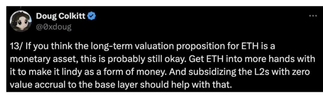 如果有未来 L2 生态繁荣的一天,作为具有网络效应的 ETH,即使不一定具有垄断效应,仍能获得增量带来的采用上的巨额回报,届时以太坊将逐渐奠定以 ETH 资产为主导的价值形式。