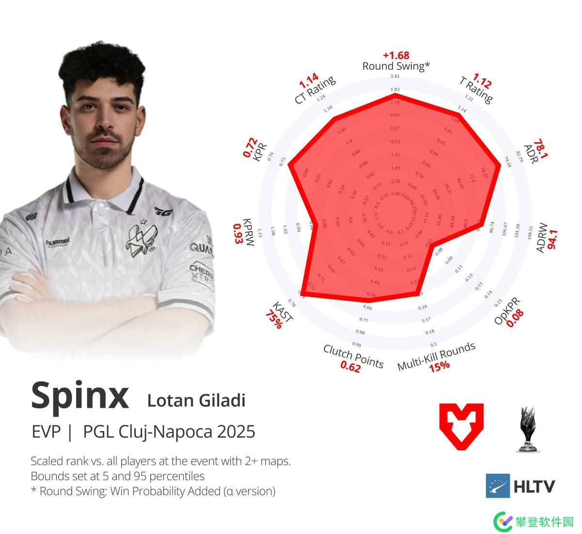 xertioN的整体赛事数据并不突出,但他在MOUZ七淘汰赛地图胜利中的四场中成为队内最佳选手,在地图胜利中表现最佳(1.37rating,+2.37 RS),并在回合胜利中领先(1.05 KPRW,108.4 ADRW)。