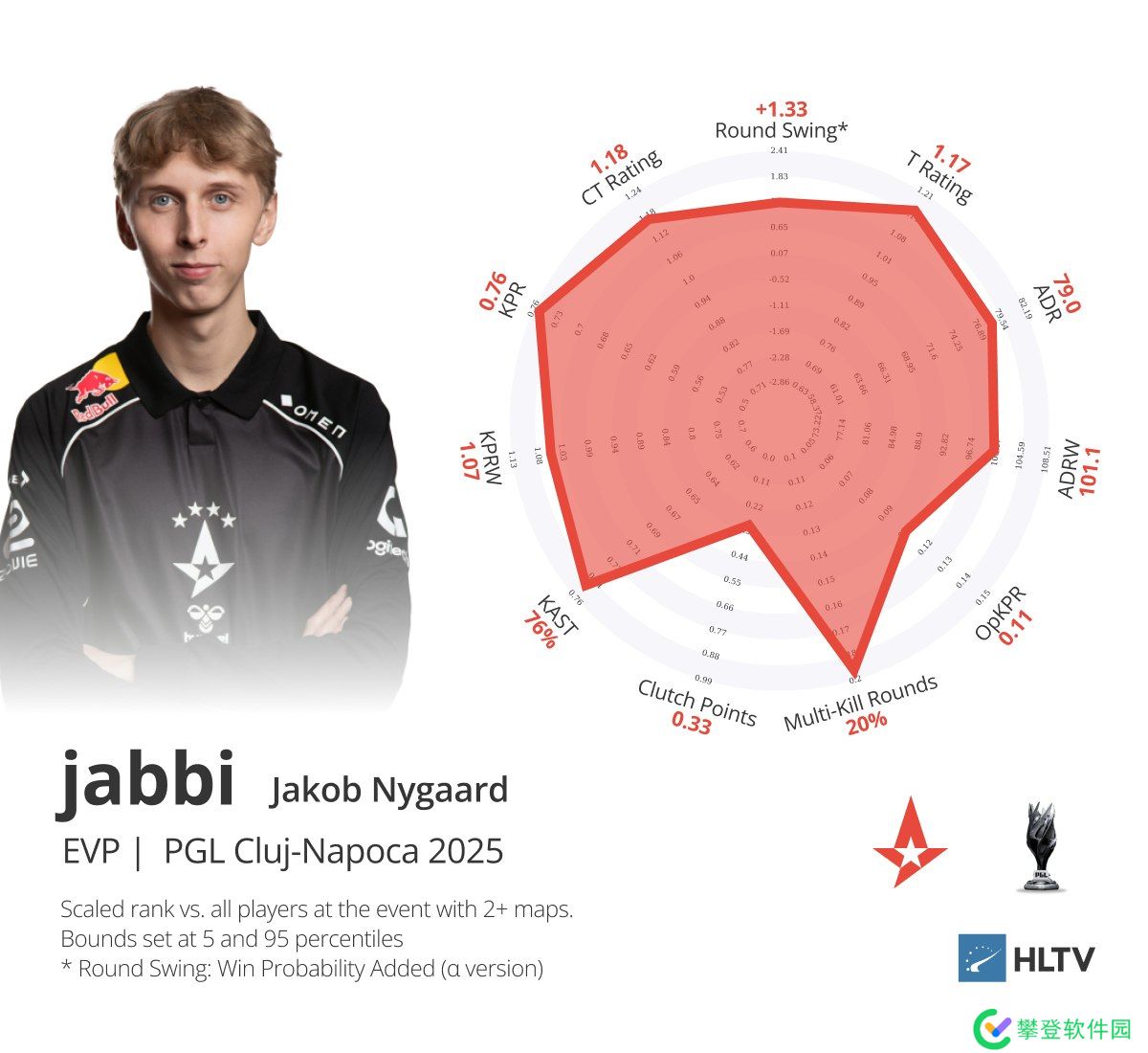 device在Astralis的地图胜利和回合影响力中表现最佳,但缺乏jabbi的高光表现和对阵世界前10队伍的表现(1.10,对比1.22)。Staehr也凭借淘汰赛中1.06的KPRW为自己赢得了机会,但最终功亏一篑。