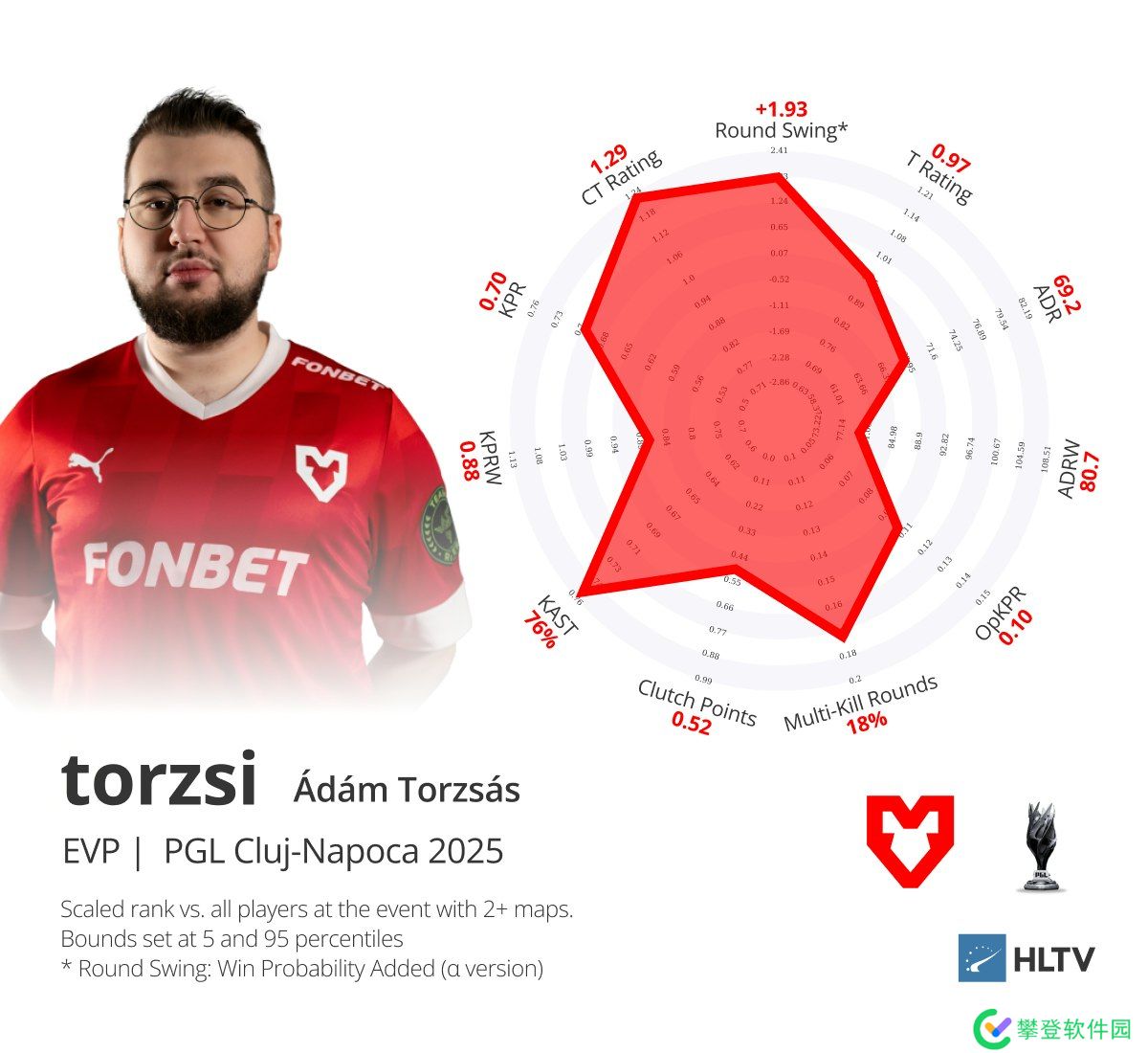 他在后期回合中的能力,无论是1vX还是2vX,是他以比NiKo和所有队友更高的回合影响力(+1.97)结束赛事的关键——torzsi的输出并不惊人,但他的击杀改变了回合的走向。