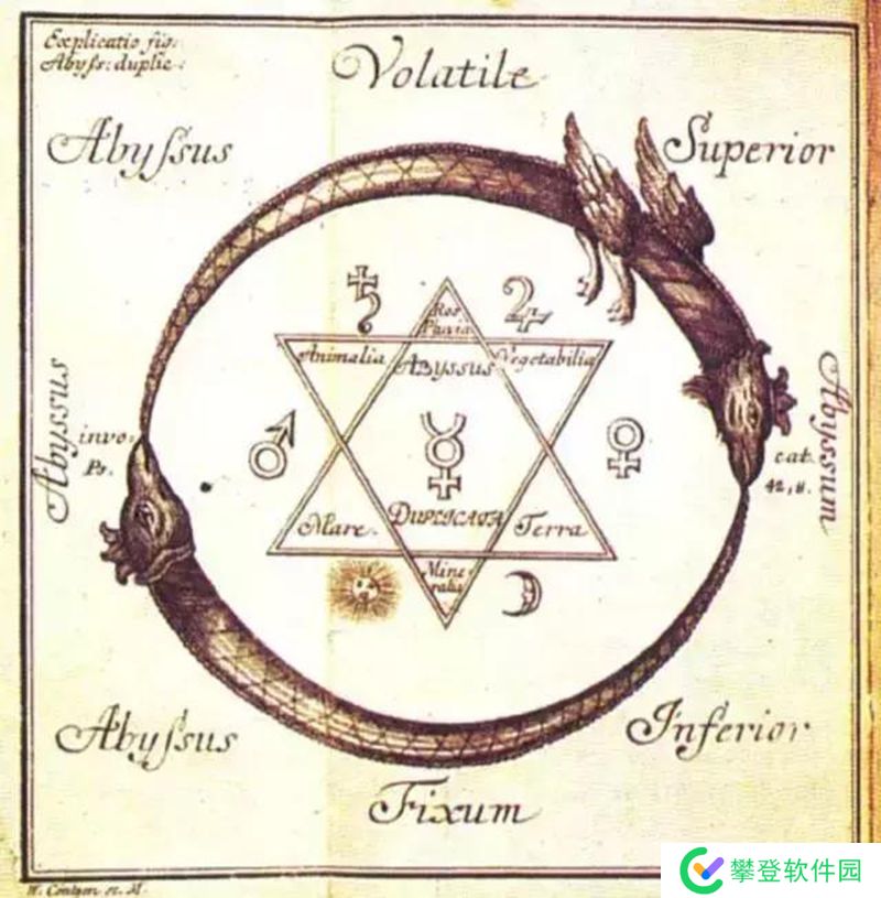 衔尾蛇是一种诺斯底主义和炼金术的符号,表达了所有事物的统一性,无论是物质的还是精神的,它永远不会消失,而是在毁灭和再创造的永恒循环中不断改变形式。