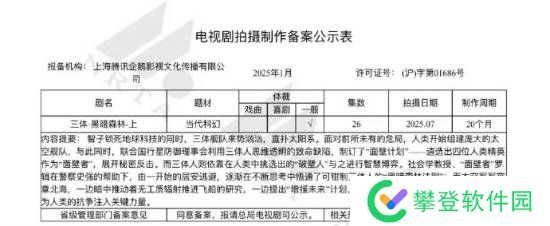 日前,腾讯企鹅影视《三体·黑暗森林-上》拍摄制作备案公示,该剧改编自刘慈欣的科幻小说《三体:黑暗森林》,预计26集,制作周期20个月,将于今年7月开拍。