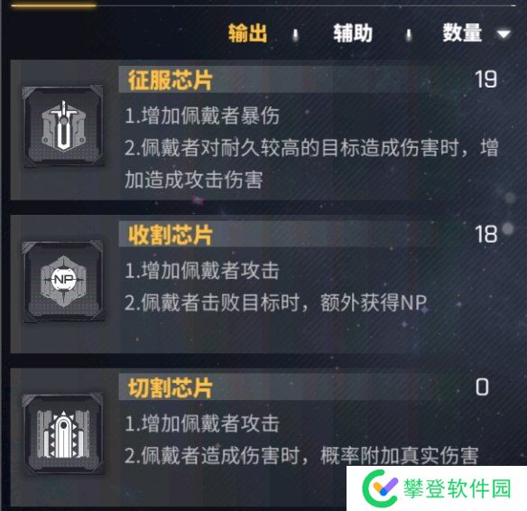 每个角色可以安装五种芯片(上,下,左,右,中),因为角色定位不同,所以推荐安装的芯片也不同,输出角色自然就要安装征服者、收割和切割等芯片,来增加输出能力。当然,芯片也有着不同的稀有度和等级,通过升级和安装更好的芯片可以更加有效的提高战斗力哦。