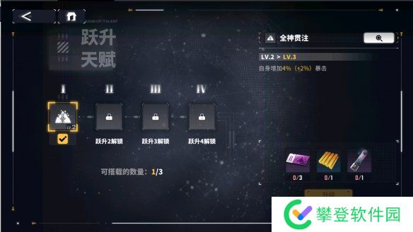 最后要讲的就是跃升时获得的天赋啦,角色每到20/40/60/70/80级时都可以跃升,在跃升后不仅能解锁更高的等级上限,还可以获得额外的跃**赋,每个角色可以搭载(佩戴)3个天赋,所以不要忘记带上你解锁的天赋。