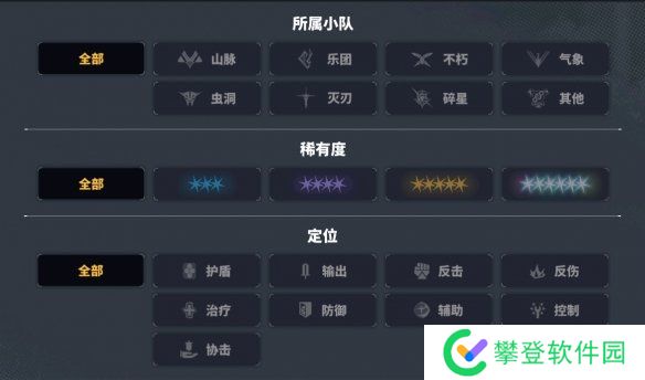 除了稀有度外,每个角色还有这不同的定位,如:护盾、输出、反击、反伤、治疗、防御、辅助、控制、协击。当然,他们也在剧情中有着自己所在的小队,大家可以在筛选界面中查看这些信息。