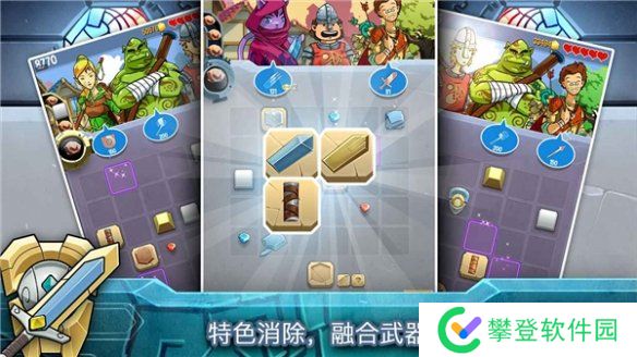 游戏巧妙的将消除、经营、冒险玩法融为一体,玩家通过完成消除关卡,以制作不同的装备和武器。