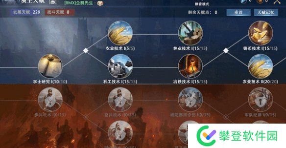 2、在天赋界面中,领主可以看到两个分支,发展天赋和战斗天赋。同时,右上角设有重置和天赋记忆按钮。