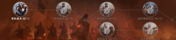 3、军事天赋以**战术为起点,涉及不同兵种战术、城防器械杀伤、士兵锻炼等方面。