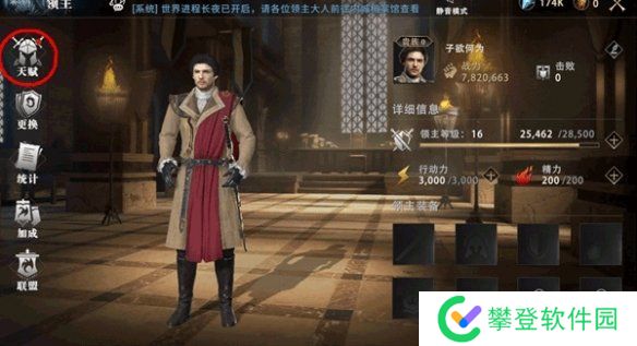 1、领主可在主界面点击左上角的头像,进入领主界面,在领主界面的左上角,领主可以找到天赋选项,点击进入天赋界面。