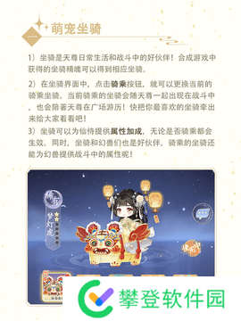 1、坐骑是玩家在日常生活和战斗中不可或缺的伙伴,通过合成在游戏中获得的坐骑精魄。