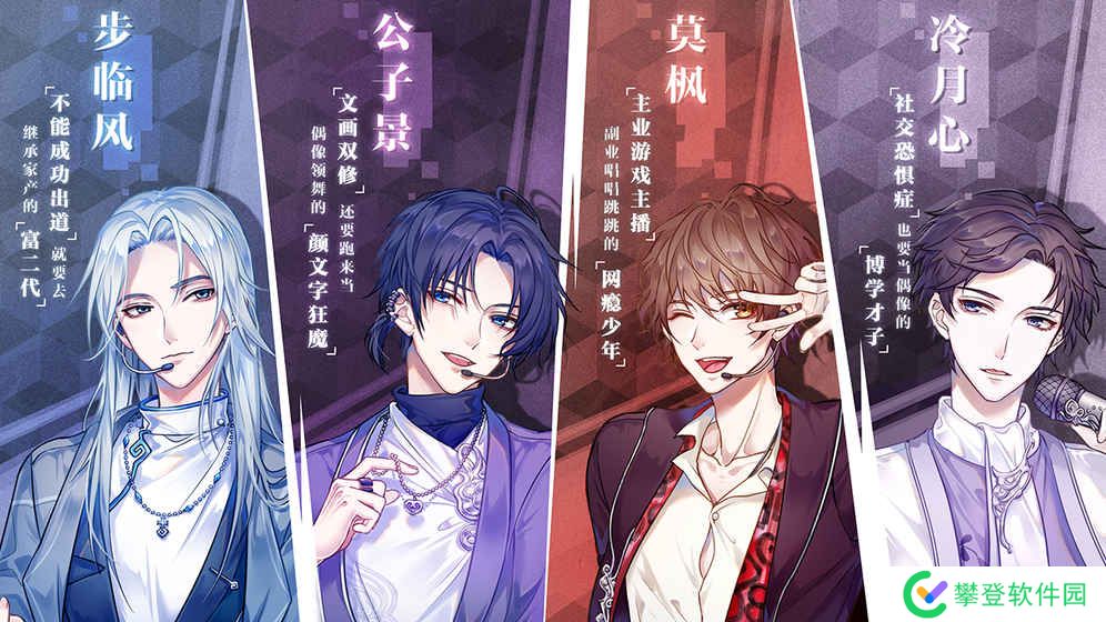 1. 游戏背景:游戏设定在一个充满梦想与挑战的娱乐圈,玩家需要面对四位个性迥异的男主,他们分别是步临风、冷月心、莫枫和公子景。他们因某种原因失去了记忆,玩家需要帮助他们找回记忆,并带领他们走向成功。