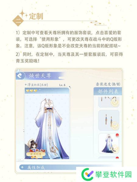 2、且此 Q 版形象不影响天尊当前实际搭配。同时,当天尊集齐一整套服装时,可获得青玉奖励。