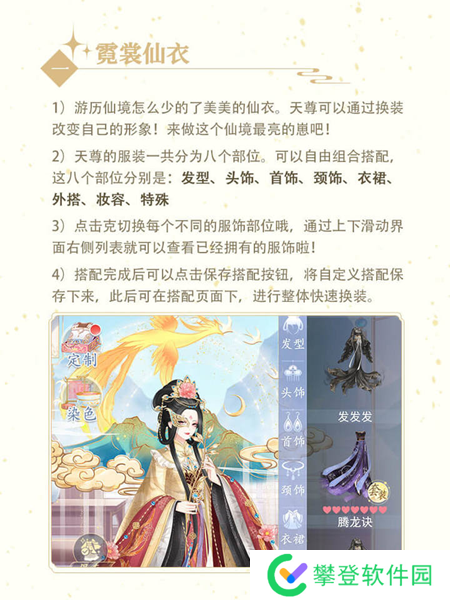 2、天尊的服装有八个部位,分别是发型、头饰、首饰、颈饰、衣裙、外搭、妆容、特殊。这些部位能自由组合搭配。