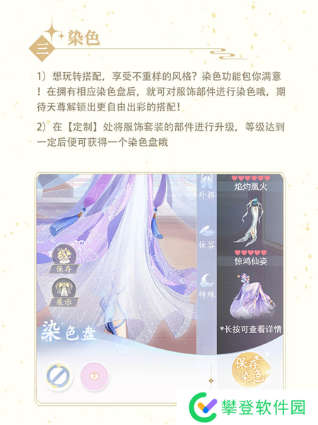 1、若想在搭配上有更多变化,享受不同风格,染色功能可供使用。有了相应染色盘后,就能对服饰部件染色,期待天尊借此解锁更多独特搭配。
