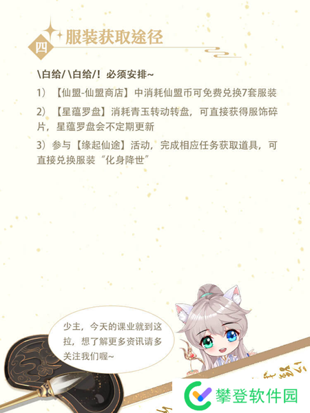 1、有免费获取途径,在【仙盟 - 仙盟商店】消耗仙盟币可免费兑换 7 套服装。