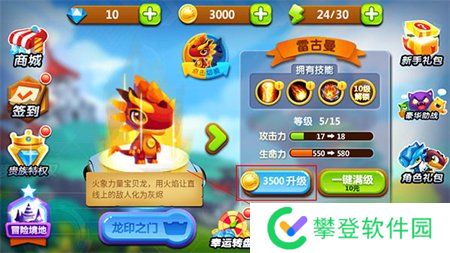 1、进入游戏后,你将获得一个新手角色——火象力量宝贝龙,在界面右侧,你可以查看它的所有技能和属性。使用金币可以提升它的战斗力等级,之后,点击“剧情模式”以继续。
