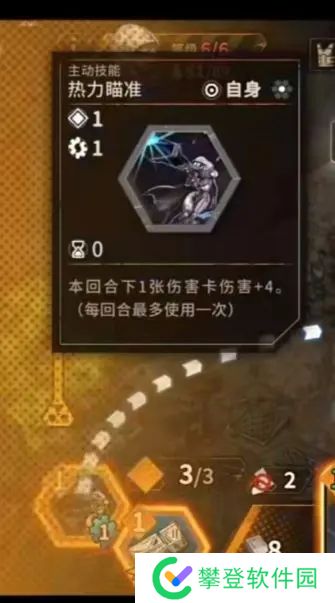费用:1,攻击:3(绿色应该是有增伤技能加成)耐久:6(使用6次后消失)