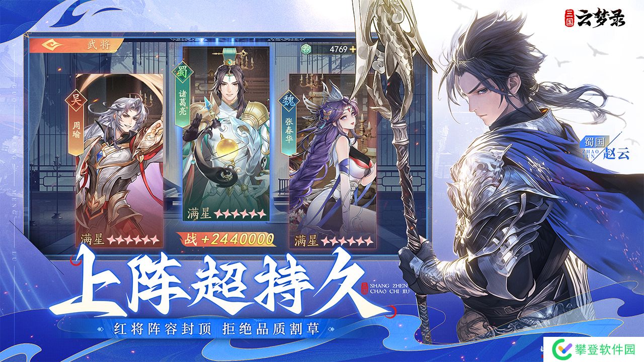 《三国云梦录》是一款以经典三国题材为背景的卡牌社交手游。杜康引梦,将你化身为三国时代的一名小将军,你将见证每一杯酒背后的权略谋断,也将亲历每一次狭路相逢的成王败寇,看是非成败,品善恶忠奸。纵横捭阖,平地惊雷,新的篇章将由你执笔!
