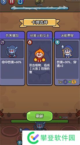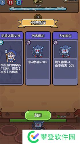 3、游戏过程中,每隔10秒钟您就有机会挑选一张卡牌,这些卡牌可以用于提升英雄角色的各种属性。