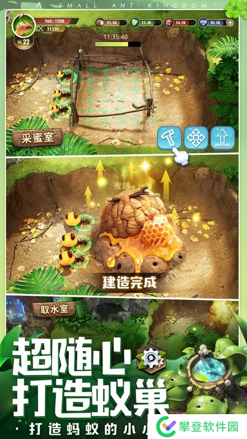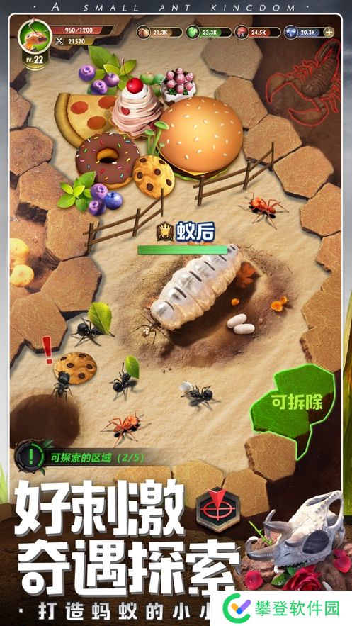 3、资源型:蚁巢中隐藏着许多生存必备的资源,化身蚁后操控工蚁挖掘蚁道,为蚁巢提供稳定的食物支持以及各种修补巢穴不可或缺的资源。探索地下世界,从无到有建设蚁国。