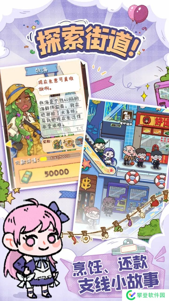 2、游戏里你会成为美食街的管理者,和守护灵一起让街道再次繁荣强大起来。