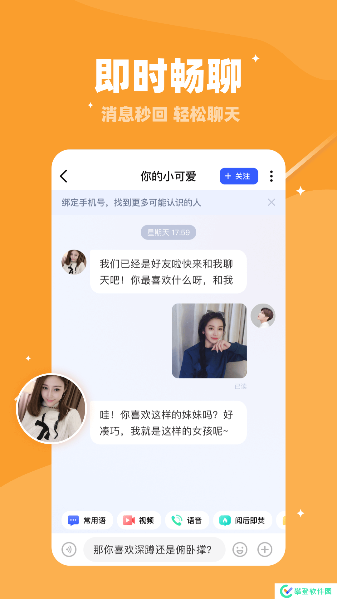 在这里,你可以爱上陌生人,聊天,交友,相亲,默默聆听;它还可以快速匹配同一城市附近的陌生朋友,24小时随时随地交友聊天。
