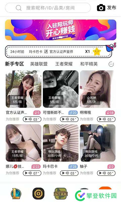 覆盖英雄联盟、王者荣耀、绝地求生、和平精英等热门游戏,24小时随约随玩,在线连麦,畅享欢乐!
