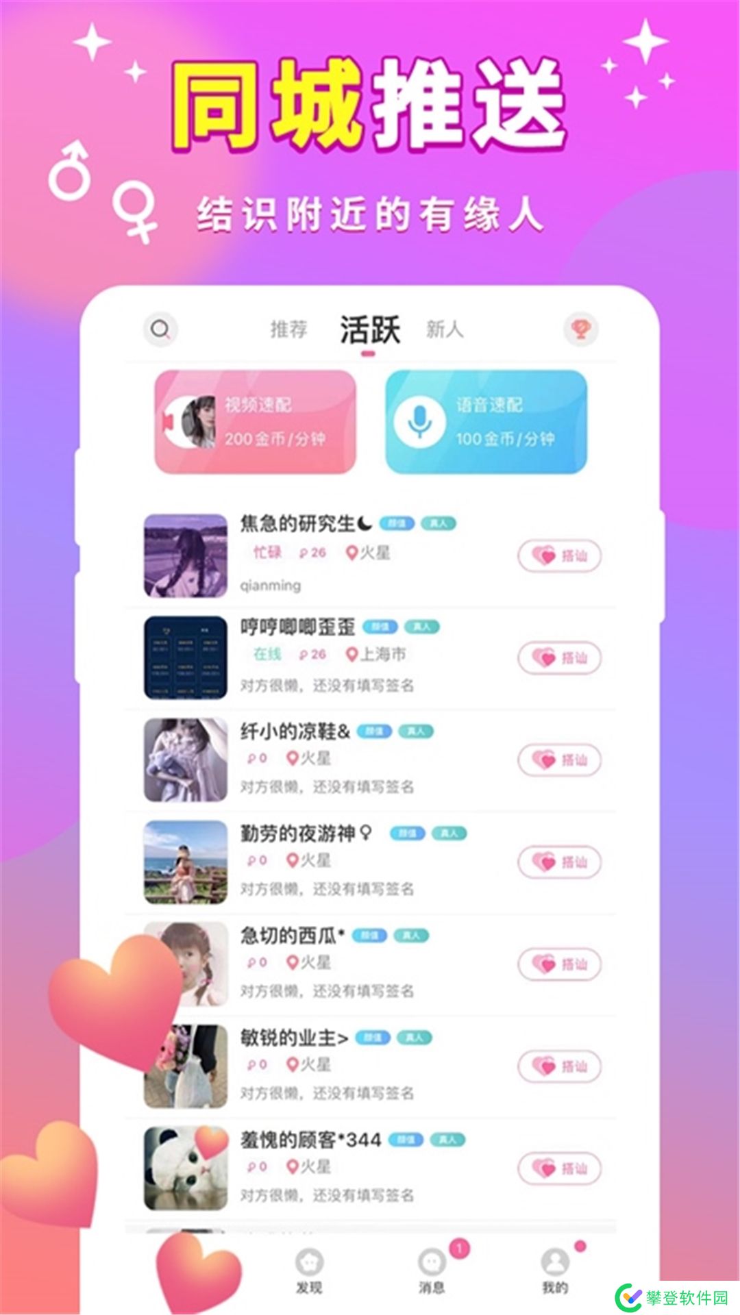 真实又靠谱的快速附近交友软件,帮你解决单身烦恼,快速找到适合你的TA。真实的陌生人社交面对面聊天软件,集恋爱,交友,找对象,约会为一体的交友约会平台。没陌生人偶遇,告别单身烦恼。