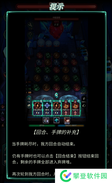6、当手牌耗尽时,我方回合自动结束,仍有手牌时也可以点击【回合结束】按钮结束回合,剩余的手牌全部进入弃牌堆,再次轮到我方回合时,从牌组抽取X张补充到手;