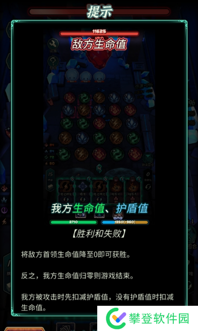 7、将敌方首领生命值降至0即可获胜,反之,我方生命值归零则游戏结束,我方被攻击时先扣减护盾值,没有护盾值时扣减生命值。