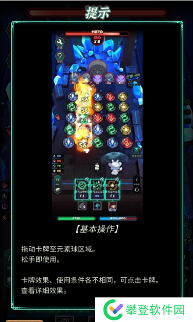 3、拖动卡牌至元素球区域,松手即使用,卡牌效果、使用条件各不相同,可点击卡牌查看详细效果;
