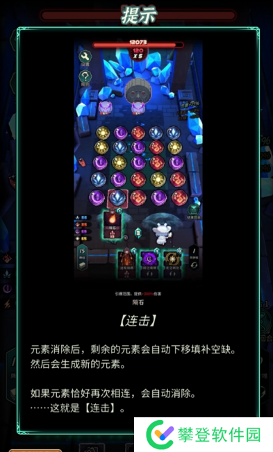 4、元素消除后,剩余的元素会自动下移填补空缺,然后会生成新的元素,如果元素恰好再次相连,会自动消除,这就是【连击】;