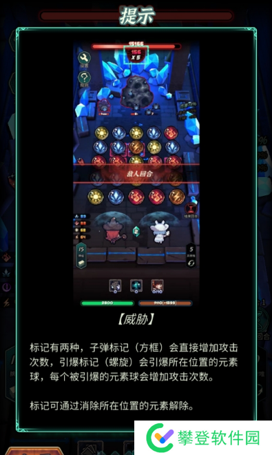 5、标记有两种,子弹标记(方框)会直接增加攻击次数,引爆标记(螺旋)会引爆所在位置的元素球,每个被引爆的元素球会增加攻击次数,标记可通过消除所在位置的元素解除;