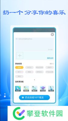 附近漂流瓶app功能【扔 一 个】把开心的事情分享给陌生人或者不开心的解决不了的事求助陌生人。