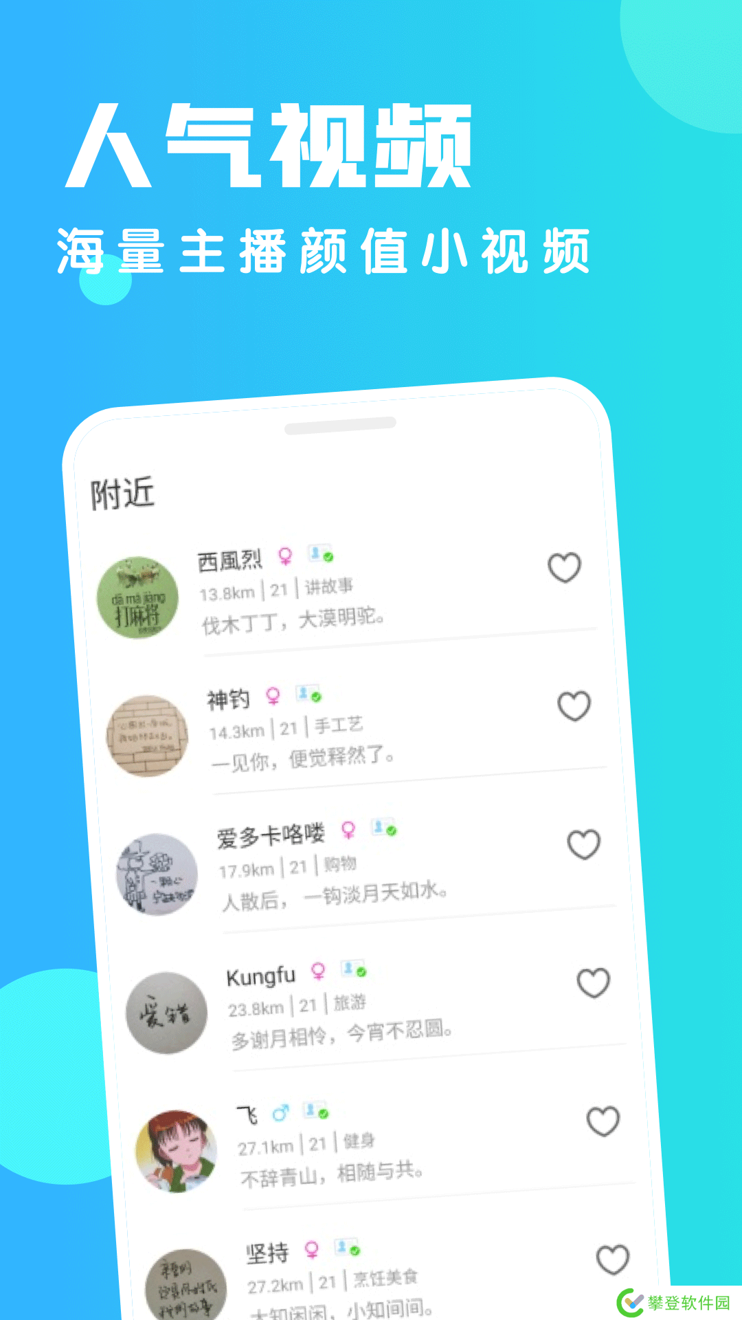 一款高品质的掌上聊天互动软件,专为单身男女打造的多种平台,在线互动交友,无需任何负担,快速匹配,让你的心交友,让陌生人可以快速进入流状态,所有人都定位自己的位置,你可以看到你身边正在活跃的朋友打招呼。