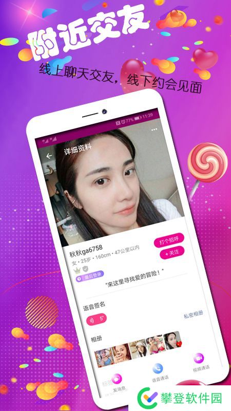 一款专业技术团队全心打造的交友娱乐软件,为广大单身的朋友提供一个相互认识和娱乐的空间, 用户简单注册,即可使用。平台会员资料丰富,信息真实,方便操作、还有不断更新的资讯。除5大基础功能:聊天,社区,发现,会员、约会外,还有秘密秘诀提升您的交际技巧,强烈推荐。 附近交友,找到有缘的ta 聊天—即时聊天,在线语音 约会—相约见面,直奔主题 交友—诚心交友,缘来是你 工作忙没时间去寻找另一半? 想交异性朋友不会踏出第一步? 父母催婚想尽快找到喜欢的对象? 所有所有想交异性朋友的朋友 来这里,快速帮你搞定