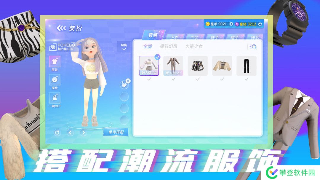 目前,POKEDO 上线的 1.0 版本,包含 " 人物装扮 "、" 个人空间 " 以及 " 社团 " 三大主要功能。用户通过人物装扮功能,可以捏脸并打扮自己的角色,帅气西服、潮流套装、夏日泳装……几十款时尚服饰可供挑选。