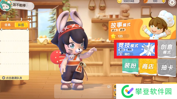 1、下载游戏后,玩家可以在游戏主页选择模式,有故事模式,也就是关卡挑战主线剧情,竞技模式是和对手比厨艺。