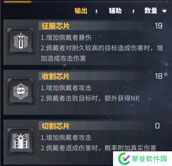 2、每个角色可以安装五种芯片(上,下,左,右,中),因为角色定位不同,所以推荐安装的芯片也不同,输出角色自然就要安装征服者、收割和切割等芯片,来增加输出能力,当然,芯片也有着不同的稀有度和等级,通过升级和安装更好的芯片可以更加有效的提高战斗力哦。