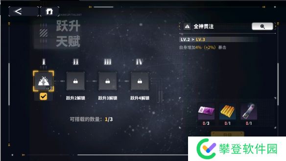 5、最后要讲的就是跃升时获得的天赋啦,角色每到20/40/60/70/80级时都可以跃升,在跃升后不仅能解锁更高的等级上限,还可以获得额外的跃**赋,每个角色可以搭载(佩戴)3个天赋,所以不要忘记带上你解锁的天赋。