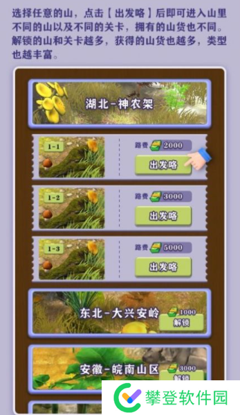 4. 解锁山地:游戏中有多个山地等待玩家解锁,每个山地的地貌特色不一,山货各异,为玩家提供了丰富的探索体验。