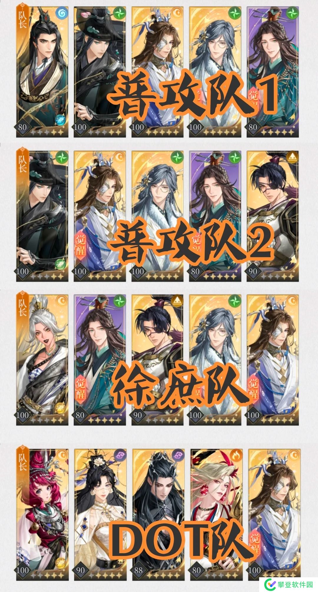 徐庶队:徐庶(核心)+夏侯惇+陈登/孔融/王粲+张邈+董奉