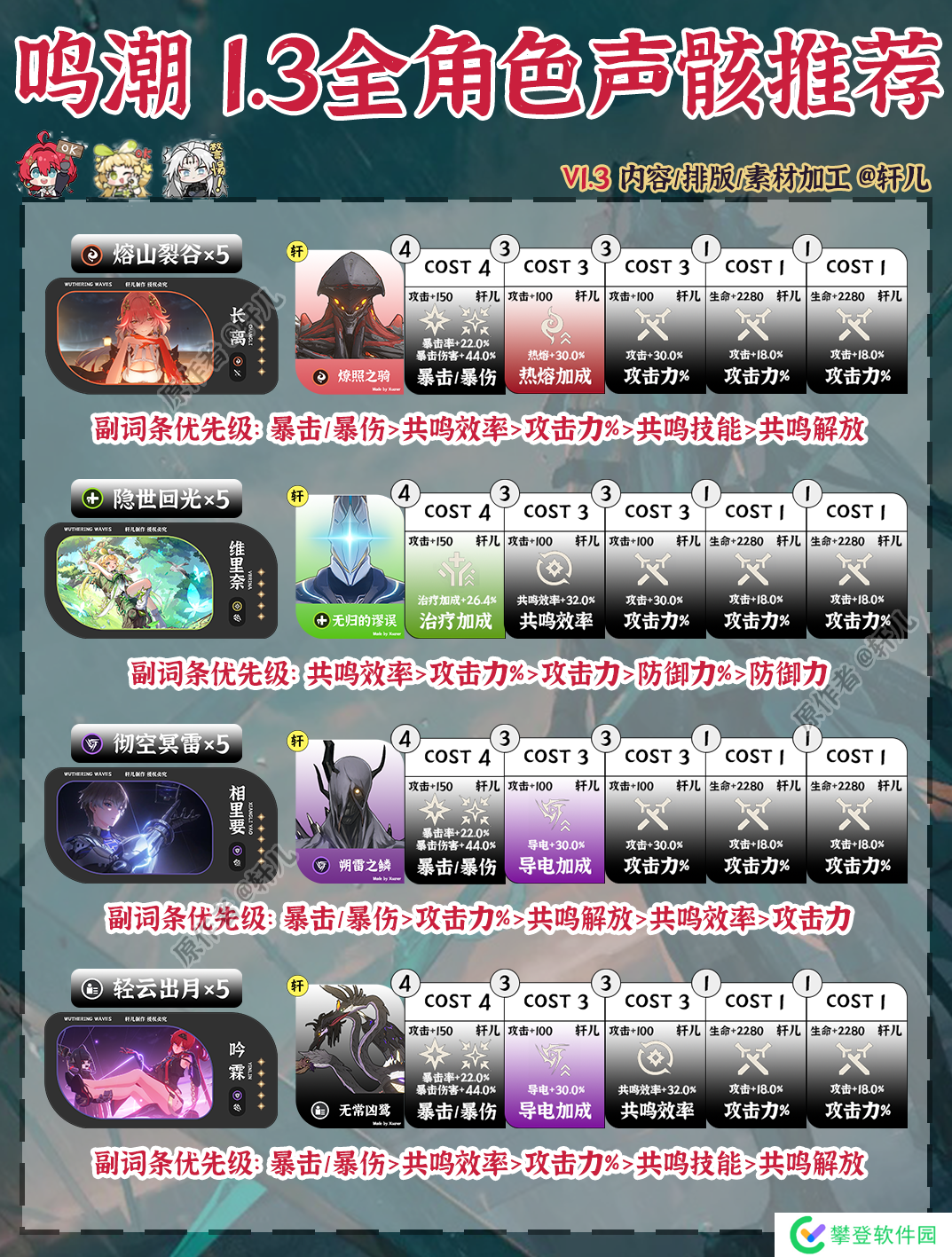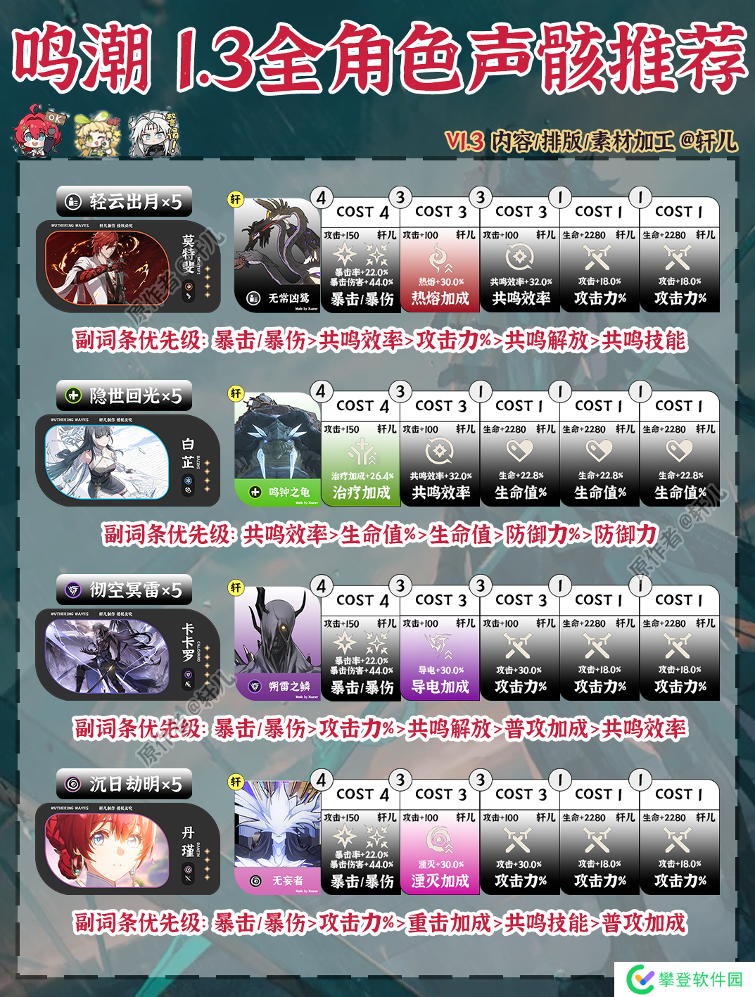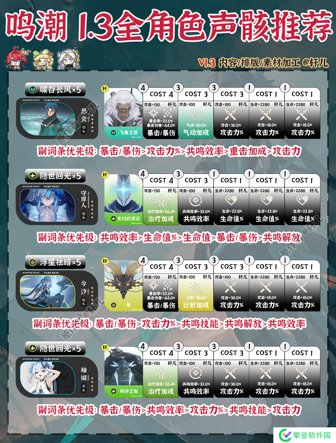 鸣潮1.3版本全角色声骸推荐出炉了,快来查缺补漏,看看哪些角色需要更换声骸~