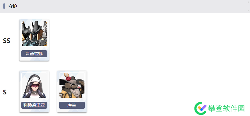 普蕾缇娜:白金,目前最肉的角色。有聚怪能力可以配合女王。由于是主线5-4通关赠送人手一个,是标准的开荒组合。