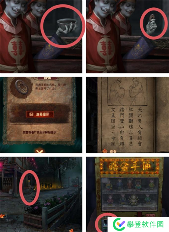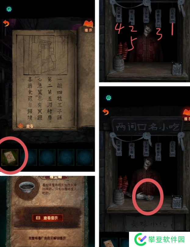 4、点击小吃店,根据《无字谶》上的线索(一敲四牲三子孙,第二第五沏楮尘,心急莫忘有冥镪),按(四牲脍、楮尘糊、子孙饭、冥镪糖、楮尘糊)的顺序点击菜单牌;触发剧情,获得【楮尘糊】