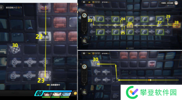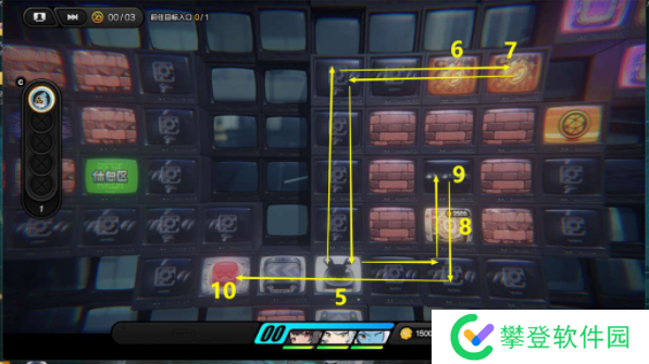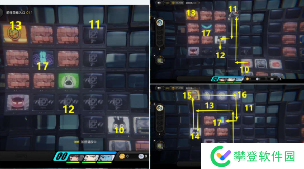 4、先去11区按R键放一个炸弹,走到12区引爆炸弹炸开左边的墙壁,依次去13-16区拿奖励,最后去17区传送。