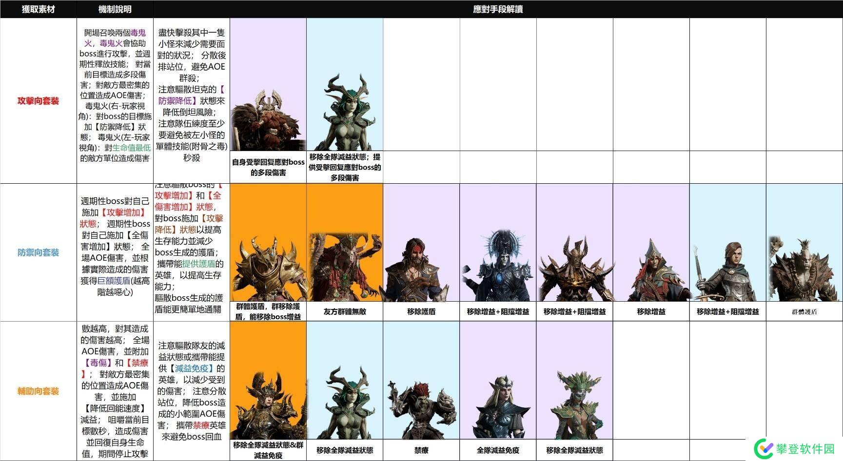 英雄装备分为”头盔、武器、盔甲和手套“四件,需要尽量凑到同名套装。而套装可以分为”攻击向“、”防御向“和”辅助向“。