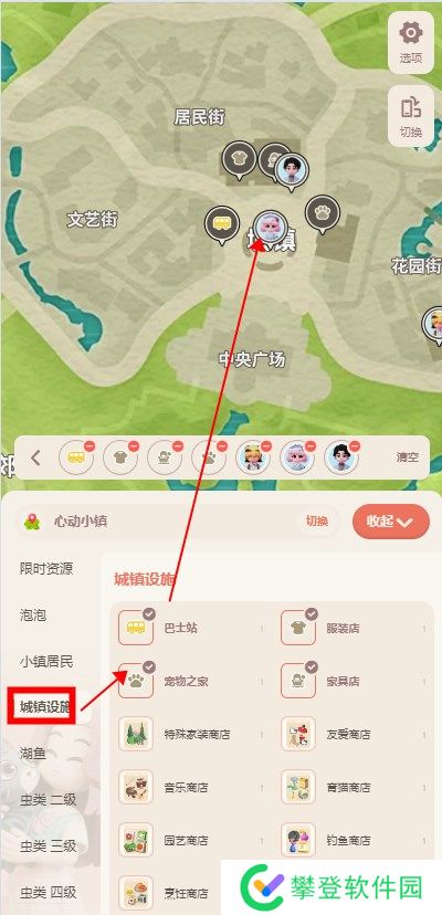 2、选择城镇设施,然后会有巴士站、服装店、家具店这些地图信息,勾选以后就会相对应的在地图上显示出位置来。